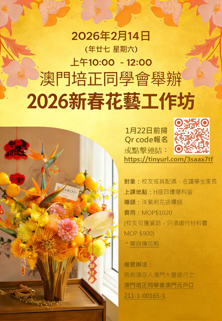 一年容易又過年,原來仲有一個月左右就農曆新年。深信大家都會諗吓點樣佈置家居,令到間屋有年味。機會嚟啦,大家!同學會舉辦2026新春花藝工作坊,各位鍾意幫屋企添加新春氣息的校友,要把握機會。如果係成雙成對嘅校友,更加要趁情人節呢個好日子,一齊動手去插花。